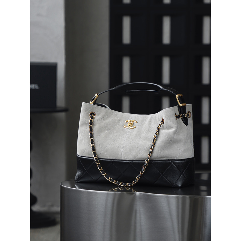 Chanel Shopping Bag Suede Calfskin, Shiny Lambskin & Gold-Tone Metal White & Black