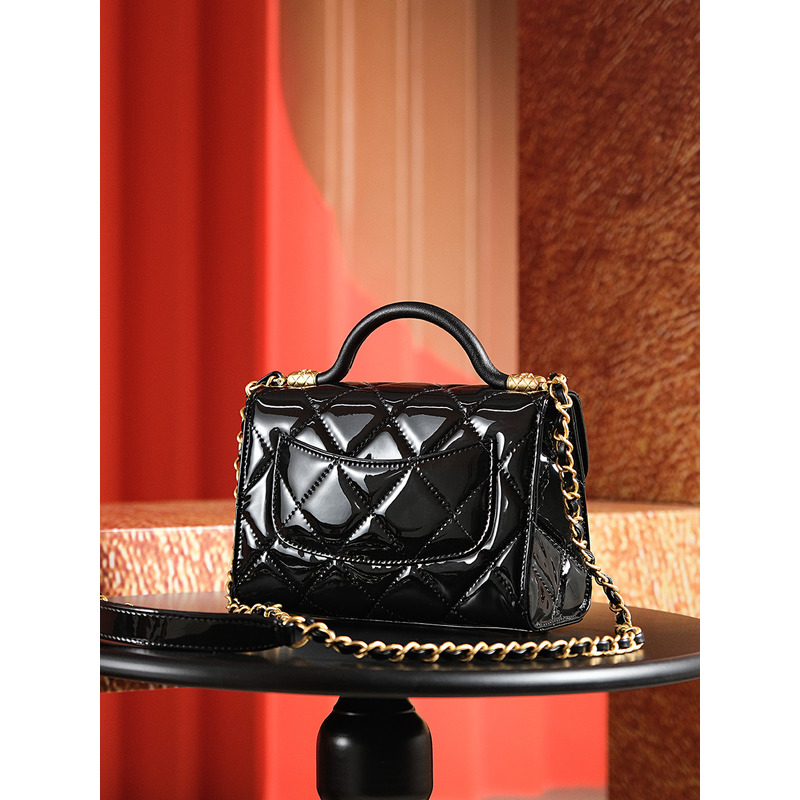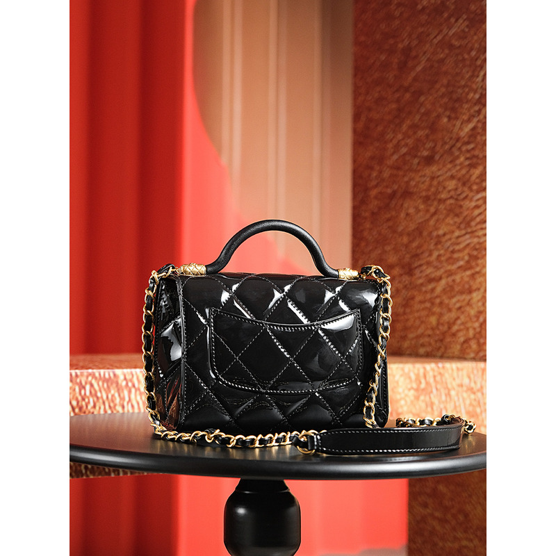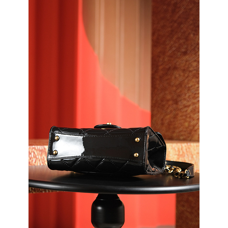 Chanel Quilted Patent Leather & 24K Gold Mental Top Handle Bag In Black