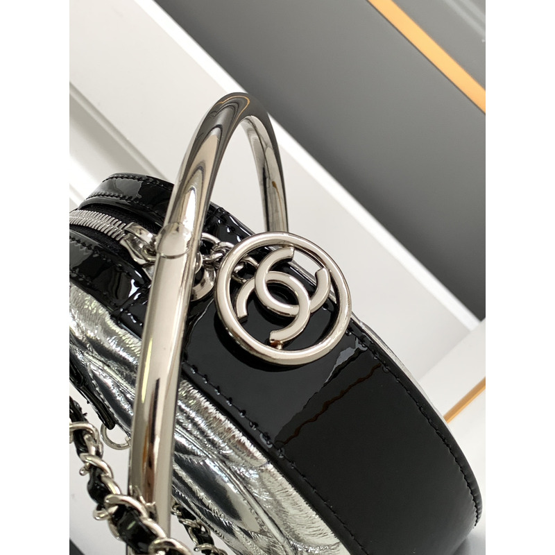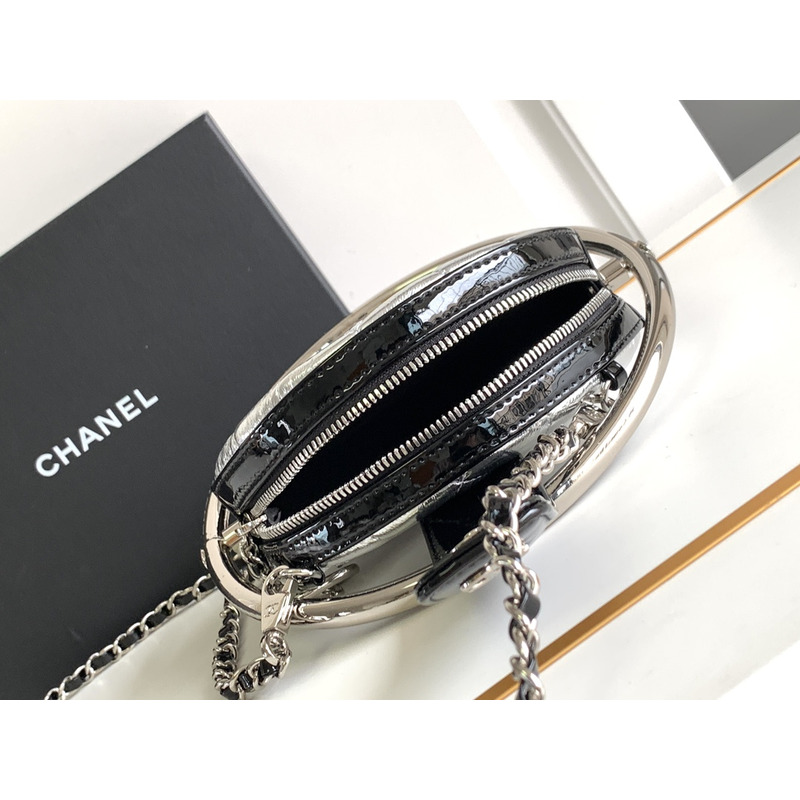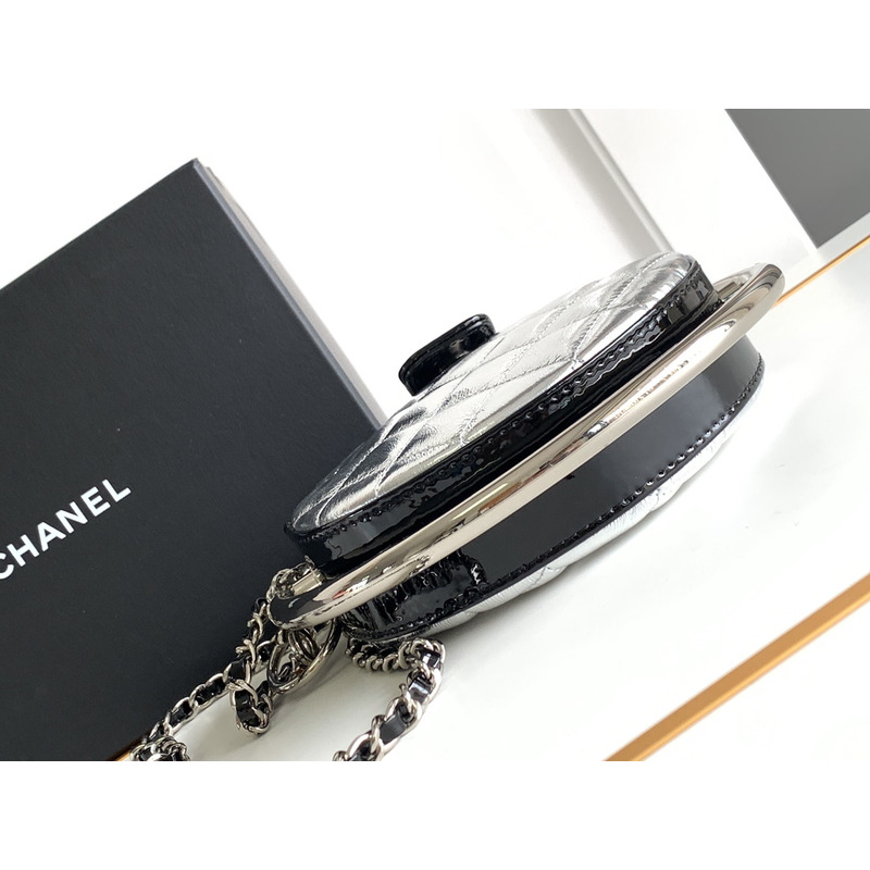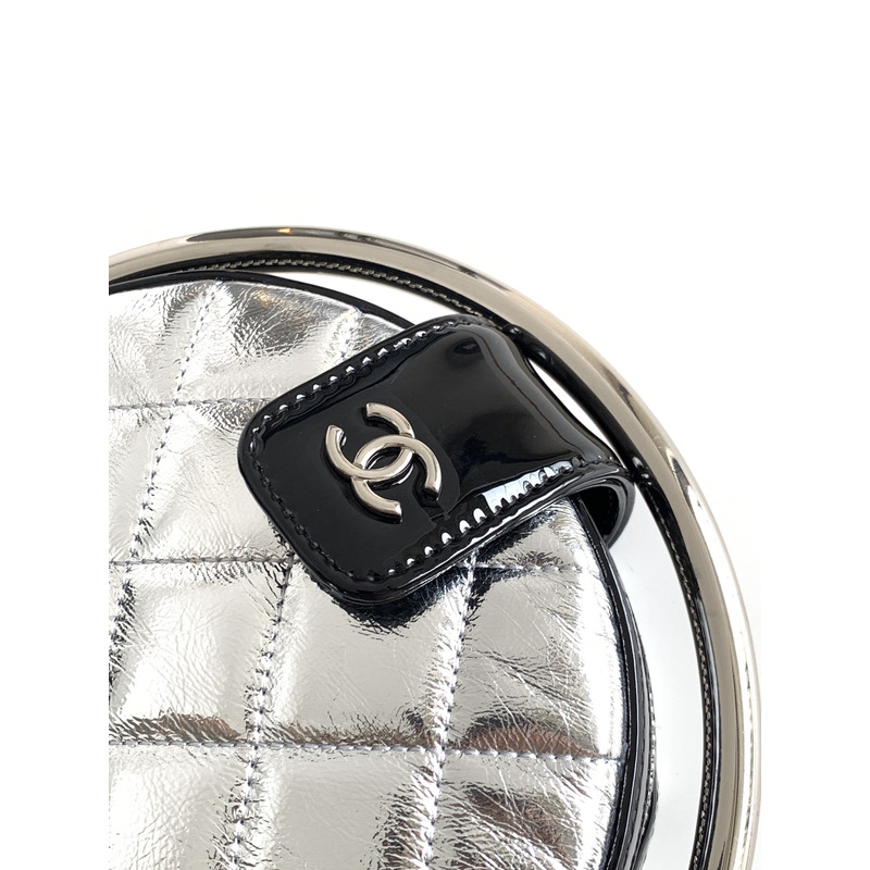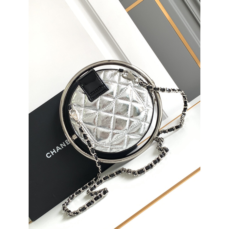 Chanel Round Quilted Leather Clutch With Chain And Metal Frame In Silver/Black